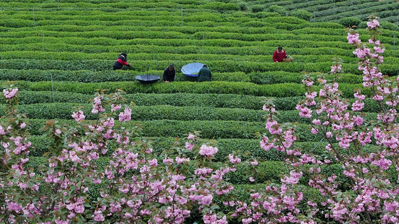 时值春茶采摘旺季,贵州省遵义市凤冈县50多万亩茶叶长势喜人,采茶的村民忙碌在高低错落的茶园,勤劳的身影描绘出生机勃勃的美丽画卷。