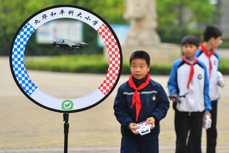 4月11日,在湘潭市雨湖区九华和平科大小学,学生在无人机课上练习操控无人机穿越障碍物。