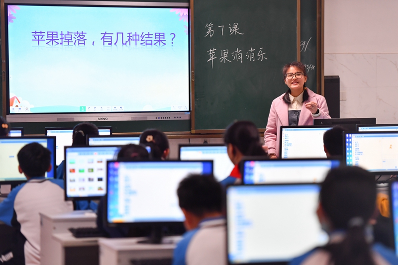 4月11日,在湘潭市雨湖区九华和平科大小学,老师在给学生上趣味编程课。