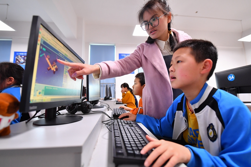 4月11日,在湘潭市雨湖区九华和平科大小学,学生在上启蒙编程课。