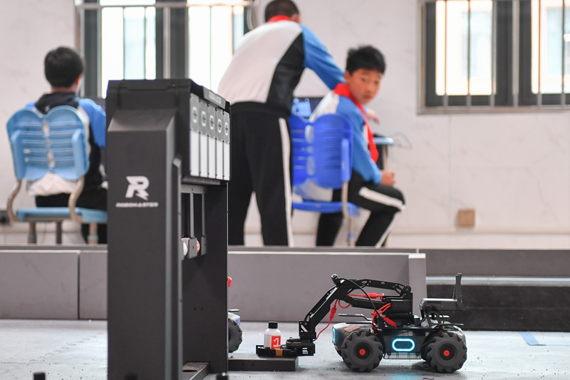 4月11日,在湘潭市雨湖区九华和平科大小学,学生在机甲大师课上模拟比赛。