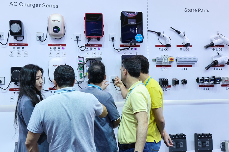 4月15日,参展商在第135届广交会上向采购商介绍新能源汽车充电设备。