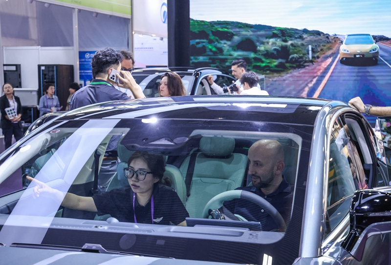 4月15日,采购商在第135届广交会上参观新能源汽车。
