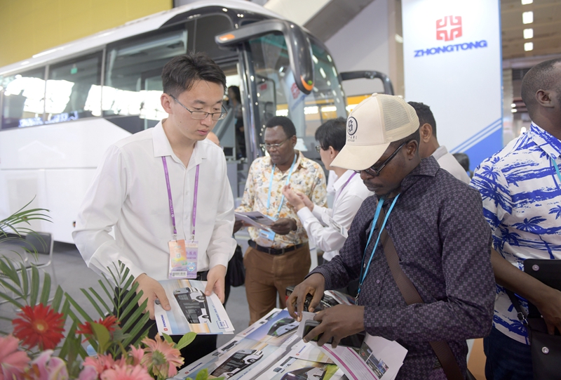 4月15日,参展商和采购商在第135届广交会中通新能源客车展台交流。