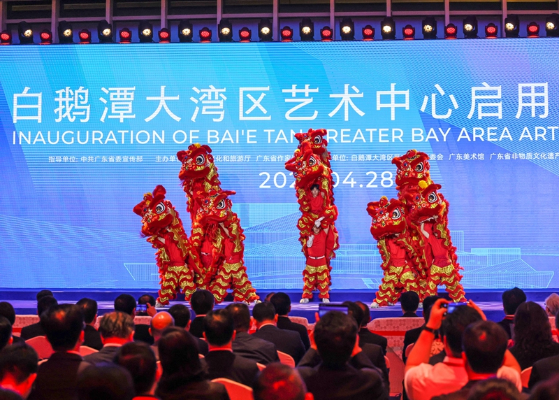 4月28日,艺人在白鹅潭大湾区艺术中心启用仪式上表演舞狮。