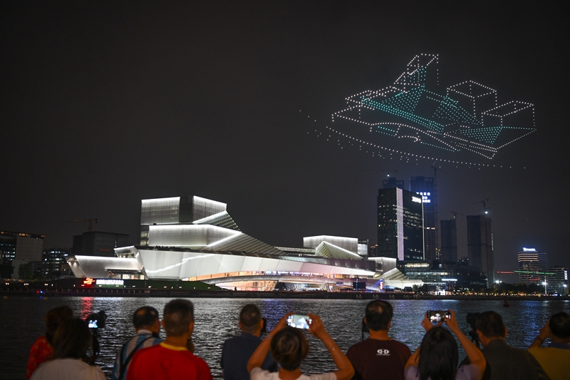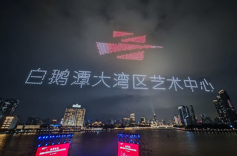 4月28日拍摄的白鹅潭大湾区艺术中心无人机表演。