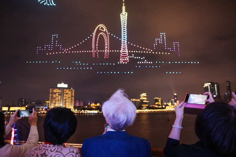 4月28日,中国工程院院士何镜堂(中)在他领衔设计的白鹅潭大湾区艺术中心观看无人机表演。