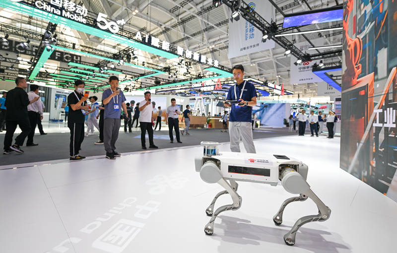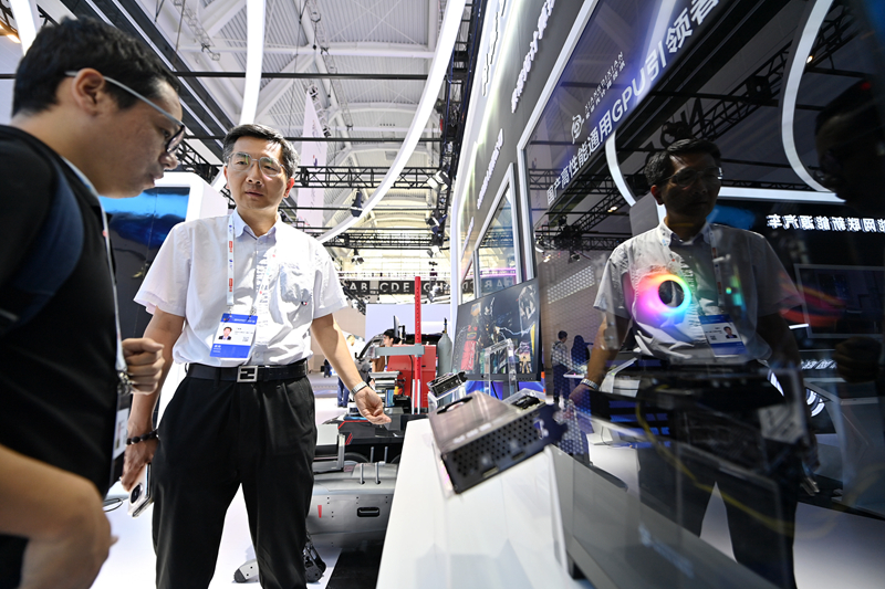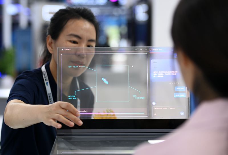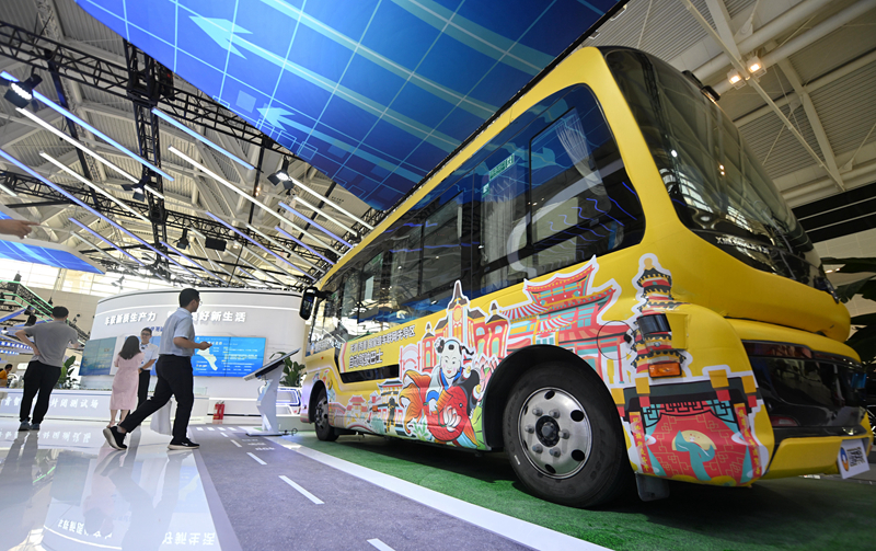 6月20日,志愿者在博览会智能交通与智能建造展区参观。