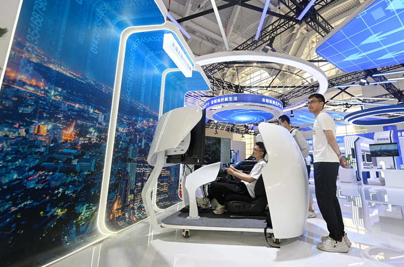 6月20日,参观者在博览会智能网联汽车展区进行驾驶体验。