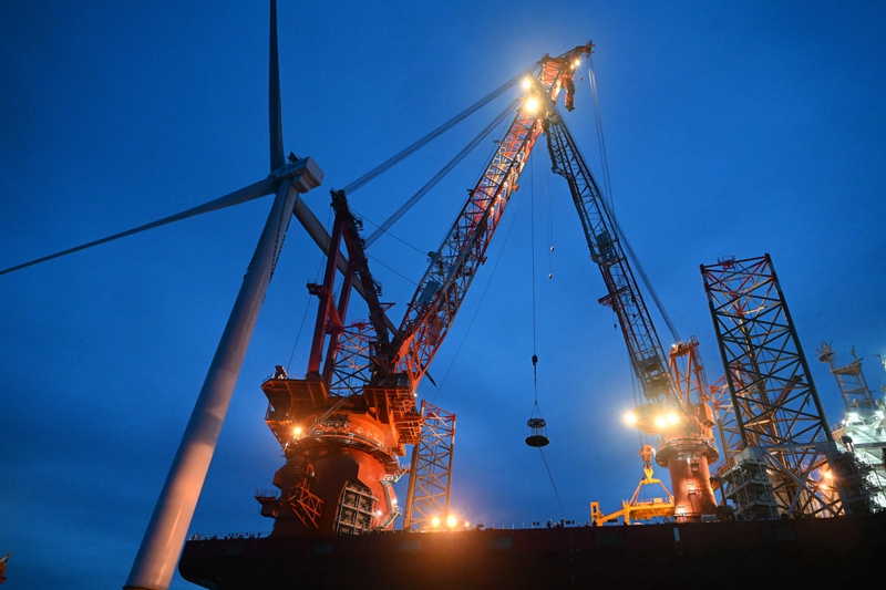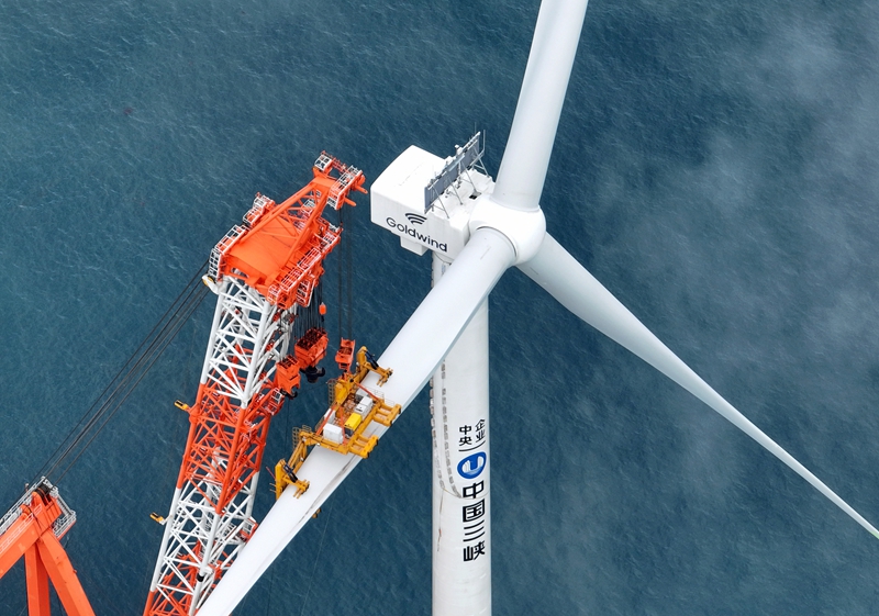 6月19日拍摄的三峡集团漳浦二期海上风电项目最后一台16兆瓦海上风电机组叶片安装现场。