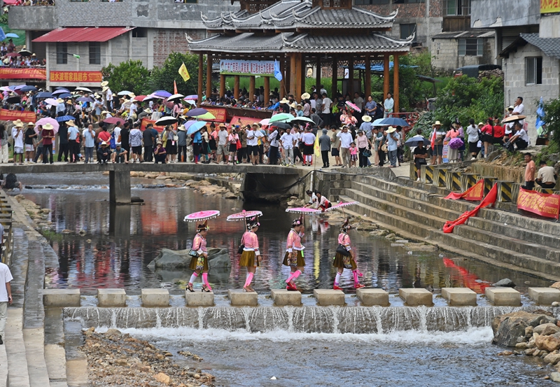 7月21日,在融水苗族自治县红水乡良双村,村民前去参加闹鱼节活动。今年,良双村利用粤桂协作资金,对河道进行了整治和改造,提升旅游基础设施条件。