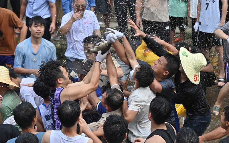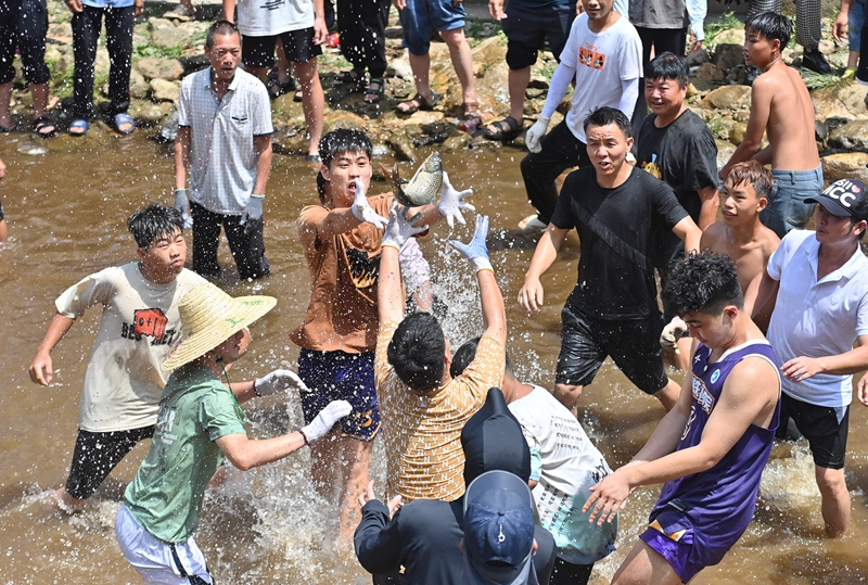 7月21日,在融水苗族自治县红水乡良双村闹鱼节活动中,村民和游客在河里抓鱼。今年,良双村利用粤桂协作资金,对河道进行了整治和改造,提升旅游基础设施条件。