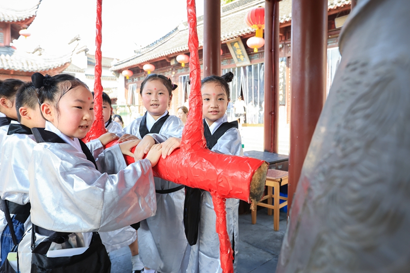 9月1日,在南京市夫子庙小学举行的“开笔礼”上,一年级新生在南京夫子庙里撞启蒙钟。