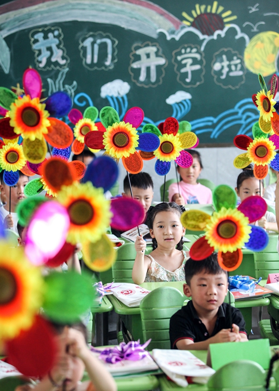 9月1日,山东省枣庄市实验小学的学生在上开学第一课。