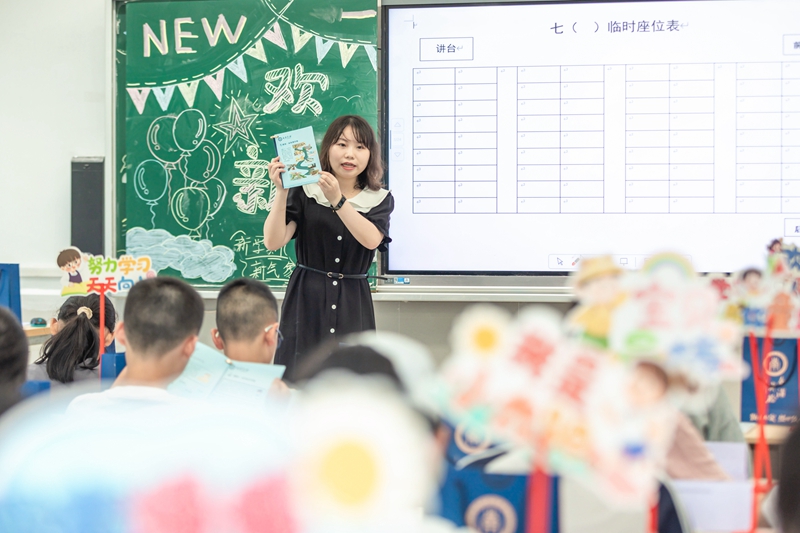 9月1日,在浙江省温州市南浦实验中学锦绣校区,老师在给七年级新生讲解新生入学手册。