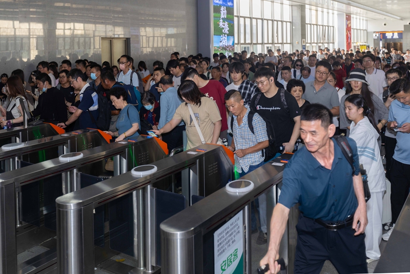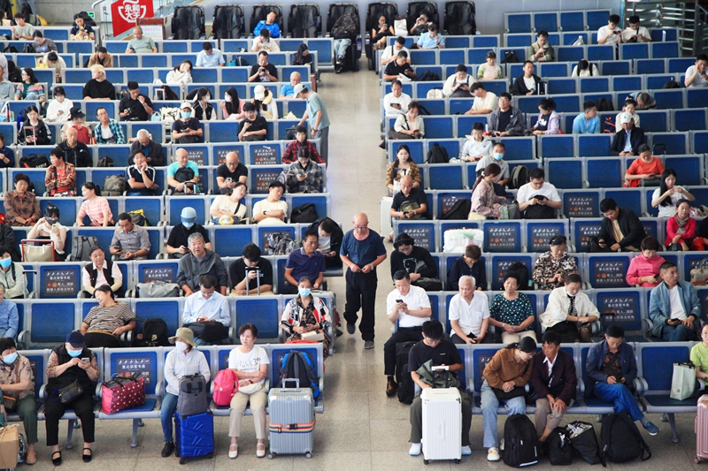 9月29日,旅客在贵阳北站候车大厅排队检票。