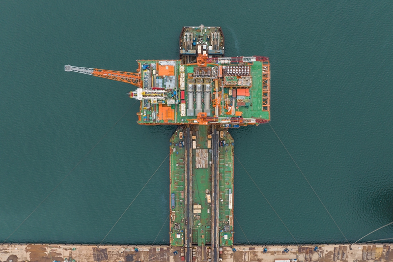 这是10月13日在山东青岛拍摄的锦州23-2油田开发项目中心热采平台装船作业现场(无人机照片)。平台装船后将赴渤海辽东湾海域,进入海上安装和联调阶段。