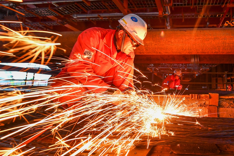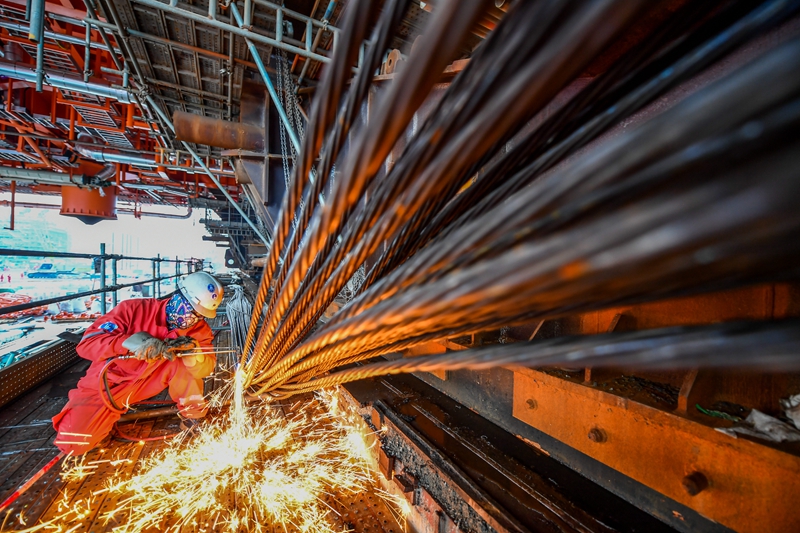 10月13日,工人在锦州23-2油田开发项目中心热采平台装船作业现场施工。