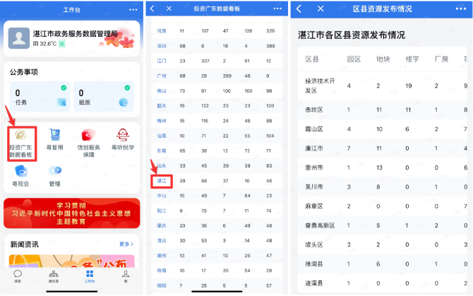 同时,“投资广东”平台与粤政易联通,设置招商引资平台数据看板,便于工作人员在工作台及时查看招商平台信息发布和对接情况,及时跟进处理企业的投资意向,进一步提升招商引资响应速度和服务水平。