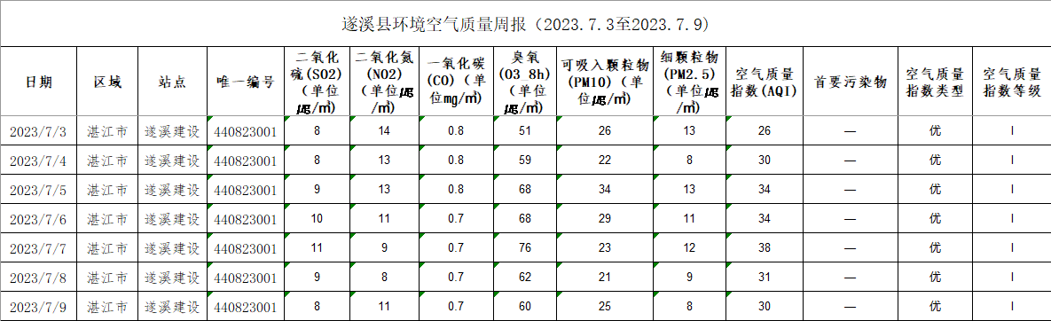 遂溪县环境空气质量周报(2023.7.3至2023.7.9)