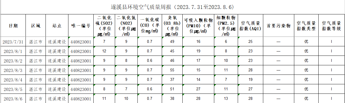 遂溪县环境空气质量周报(2023.7.31至2023.8.6)