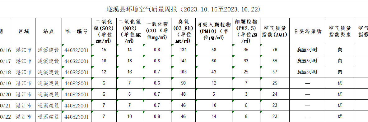 遂溪县环境空气质量周报(2023.10.16至2023.10.23)