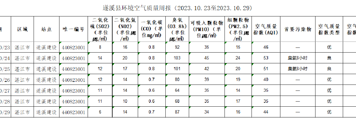 遂溪县环境空气质量周报(2023.10.23至2023.10.29)
