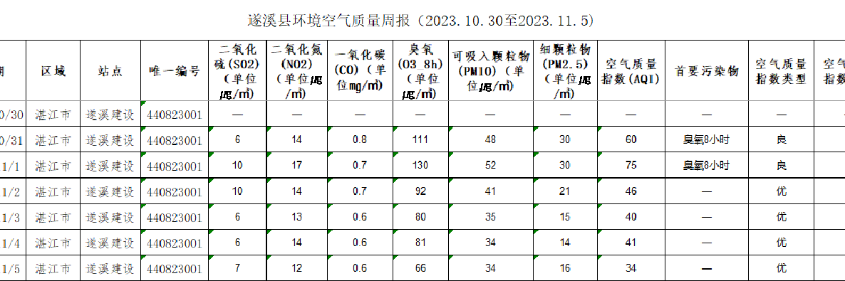 遂溪县环境空气质量周报(2023.10.30至2023.11.05)