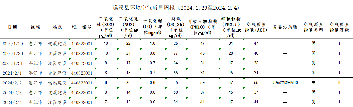 遂溪县环境空气质量周报(2024.1.29至2024.2.4)