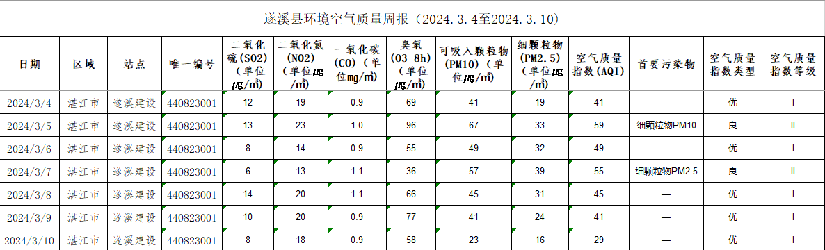 遂溪县环境空气质量周报(2024.3.04至2024.3.10)