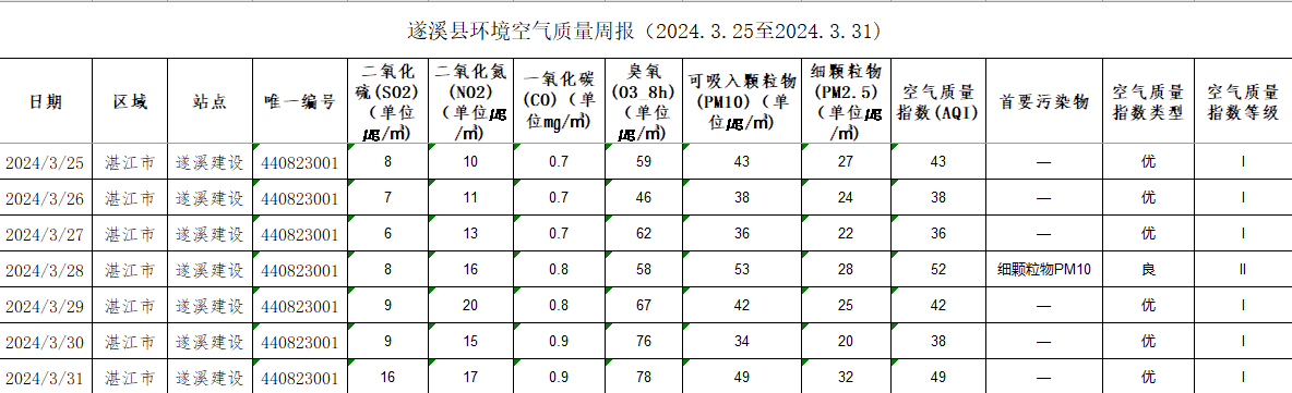 遂溪县环境空气质量周报(2024.3.25至2024.3.31)