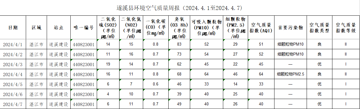 遂溪县环境空气质量周报(2024.4.01至2024.4.07)