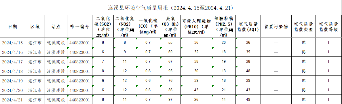 遂溪县环境空气质量周报(2024.4.15至2024.4.21)