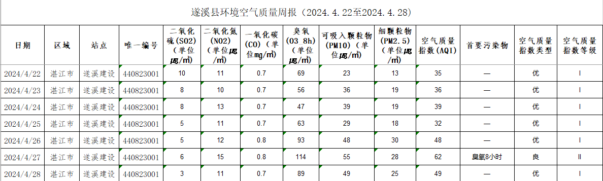 遂溪县环境空气质量周报(2024.4.22至2024.4.28)