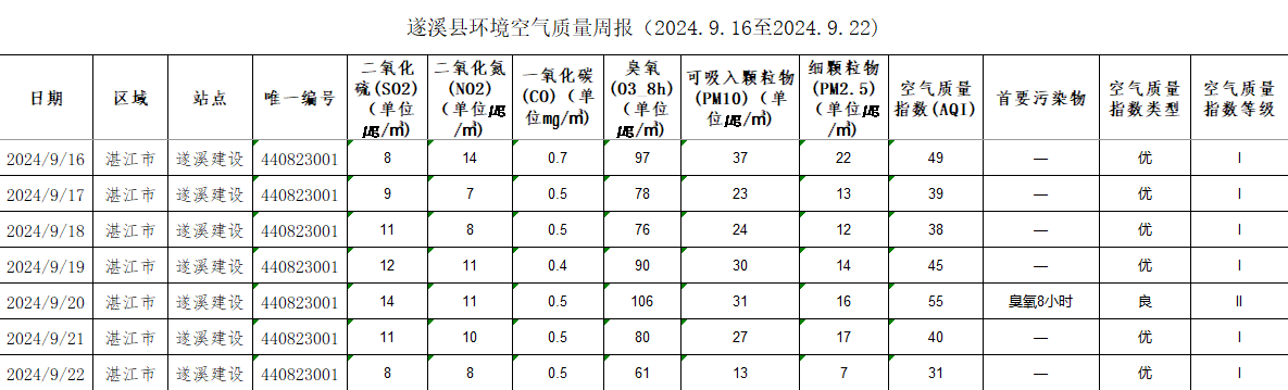 遂溪县环境空气质量周报(2024.9.16至2024.9.22)