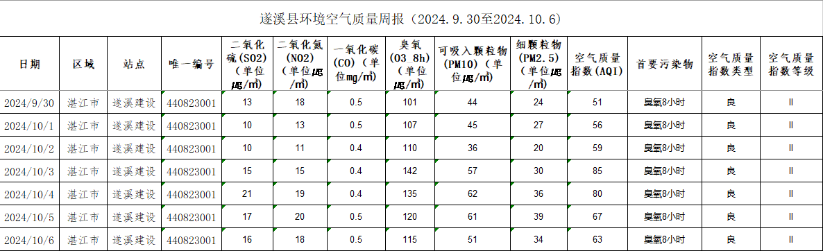 遂溪县环境空气质量周报(2024.9.30至2024.10.06)