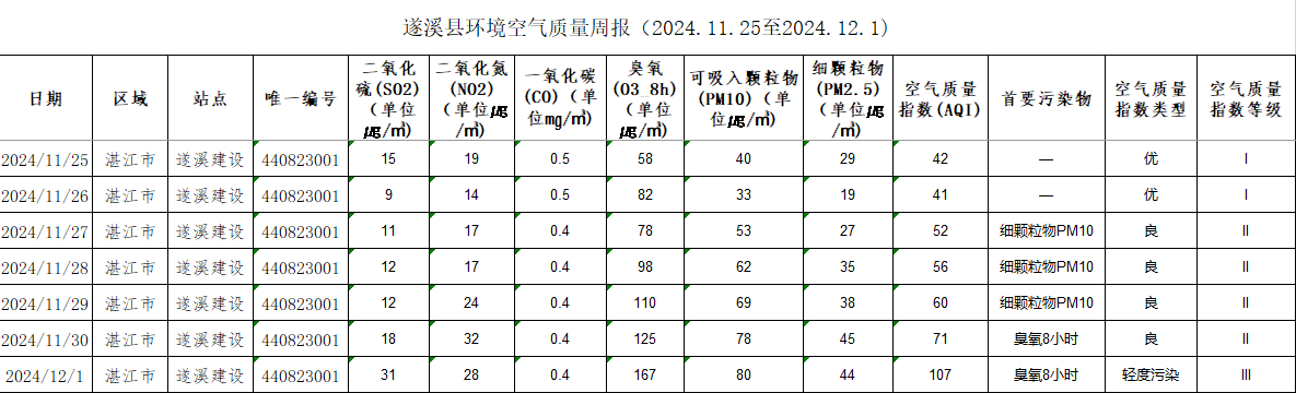 遂溪县环境空气质量周报(2024.11.25至2024.12.01)