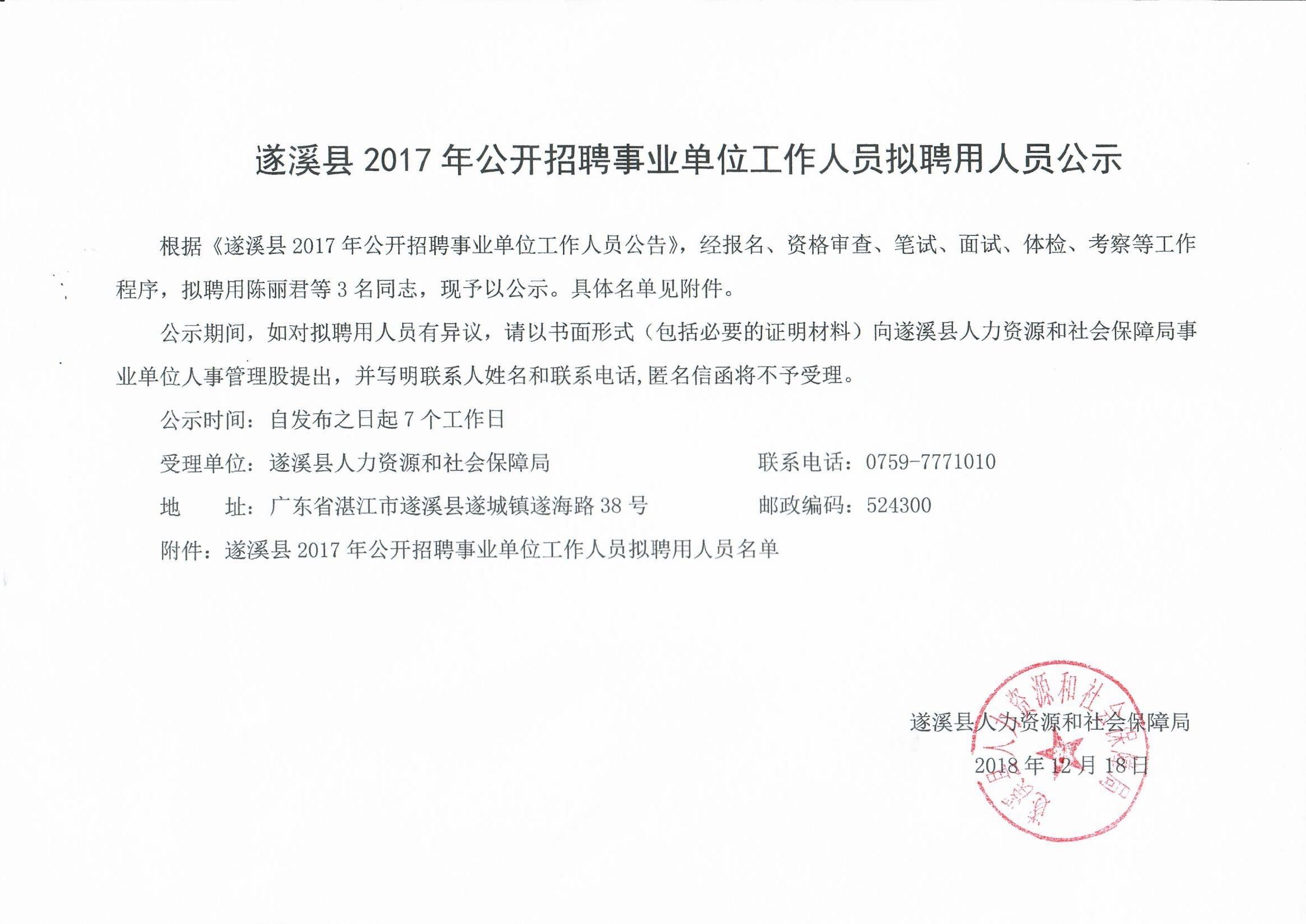 遂溪县2017年公开招聘事业单位工作人员拟聘用人员公示