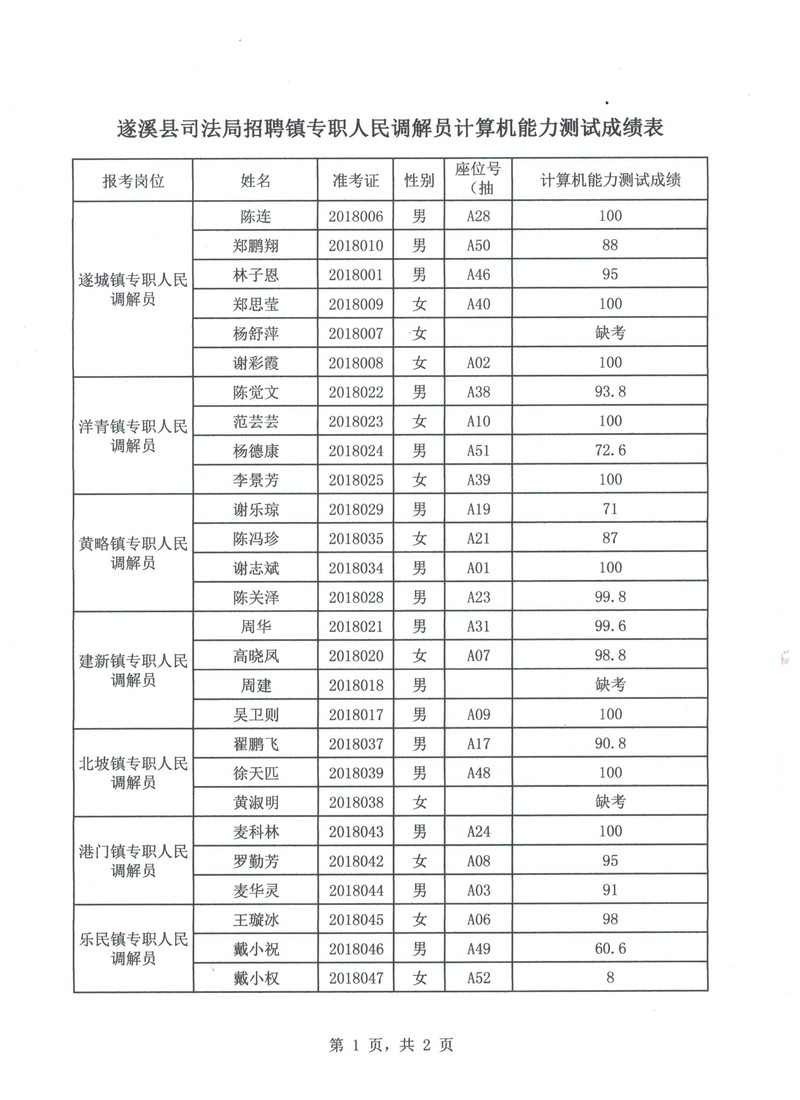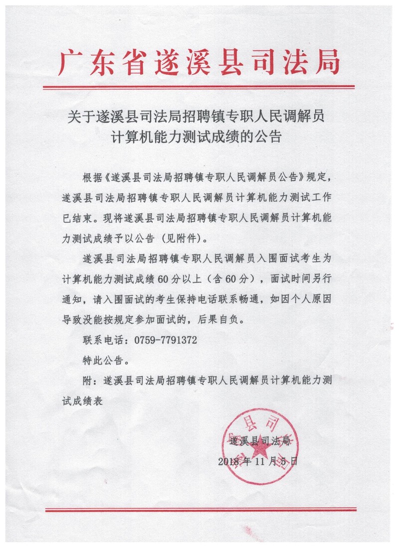 关于遂溪县司法局招聘镇专职人民调解员计算机能力测试成绩的公告