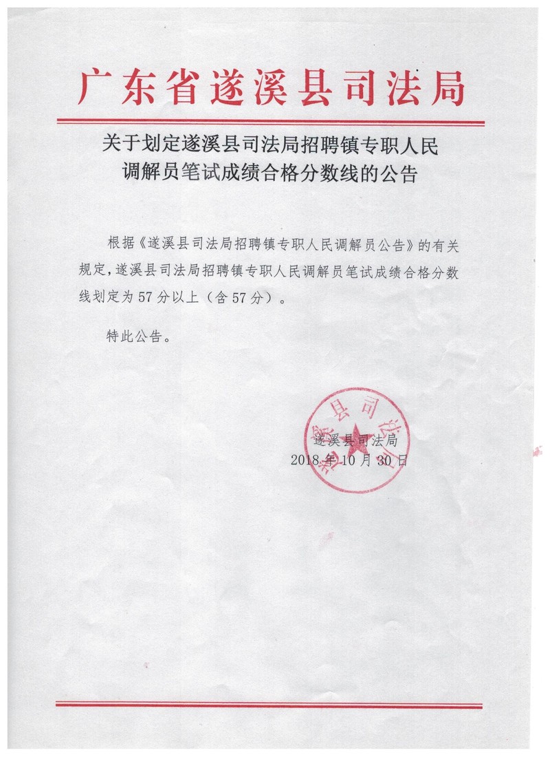 关于划定遂溪县司法局招聘镇专职人民调解员笔试成绩合格分数线的公告