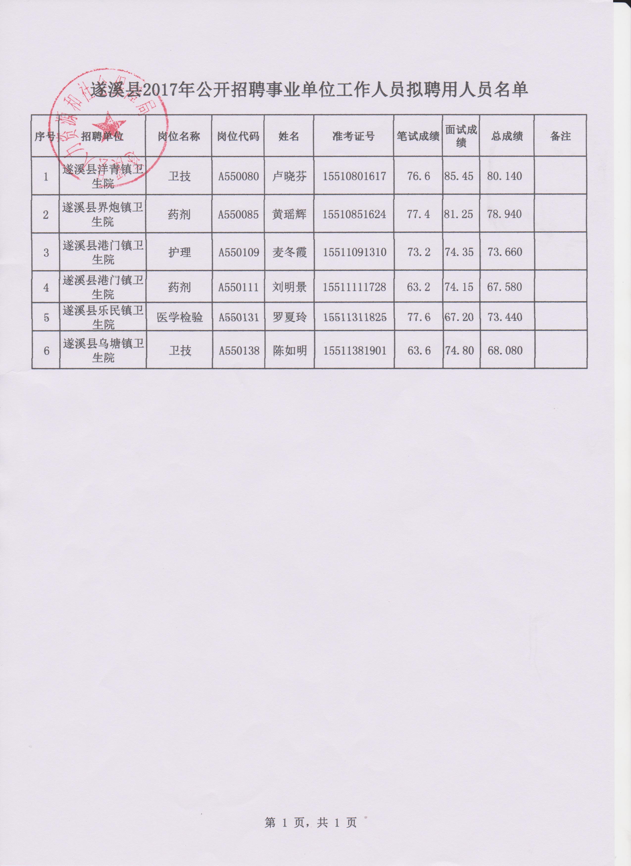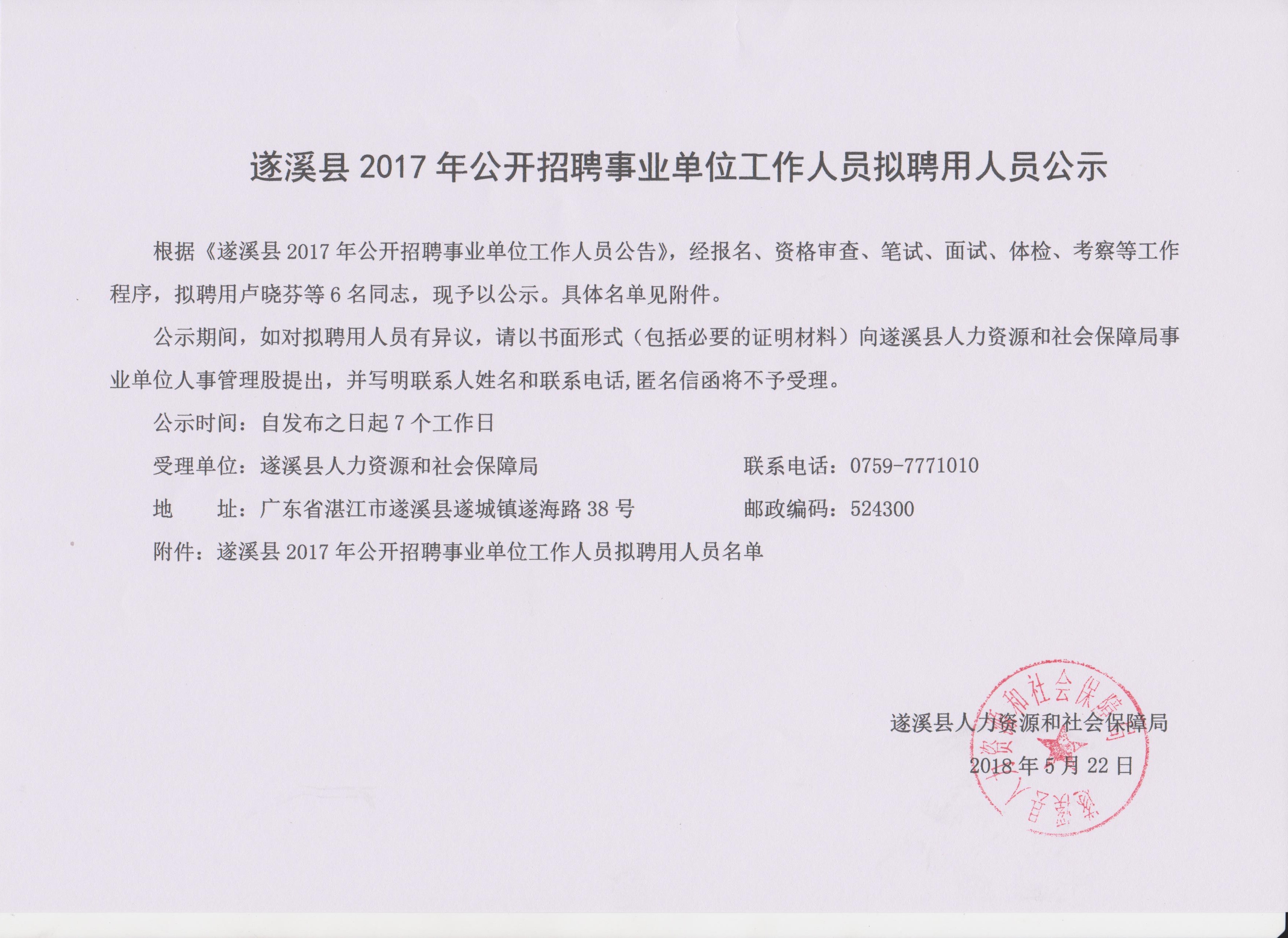 遂溪县2017年公开招聘事业单位工作人员拟聘用人员公示