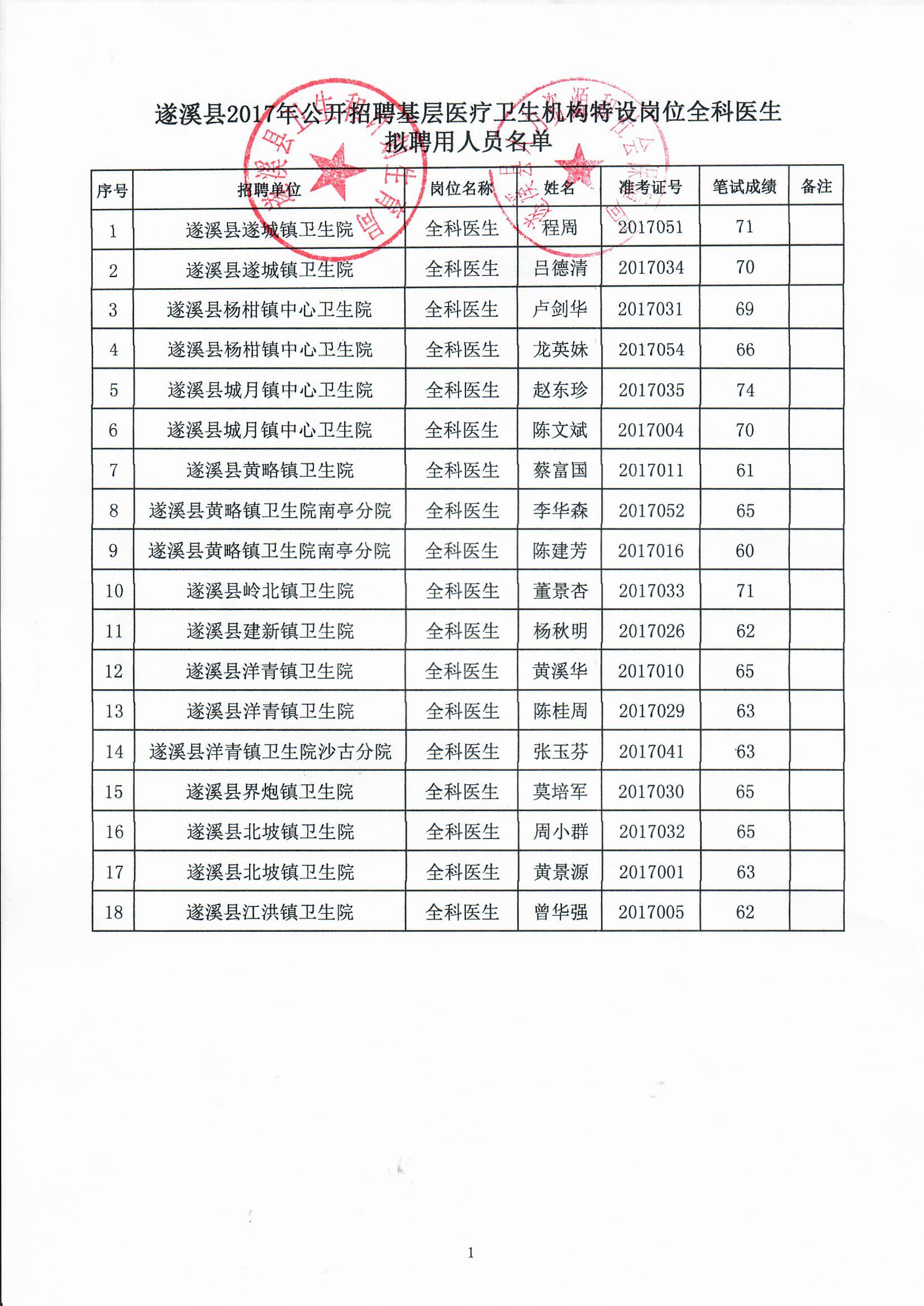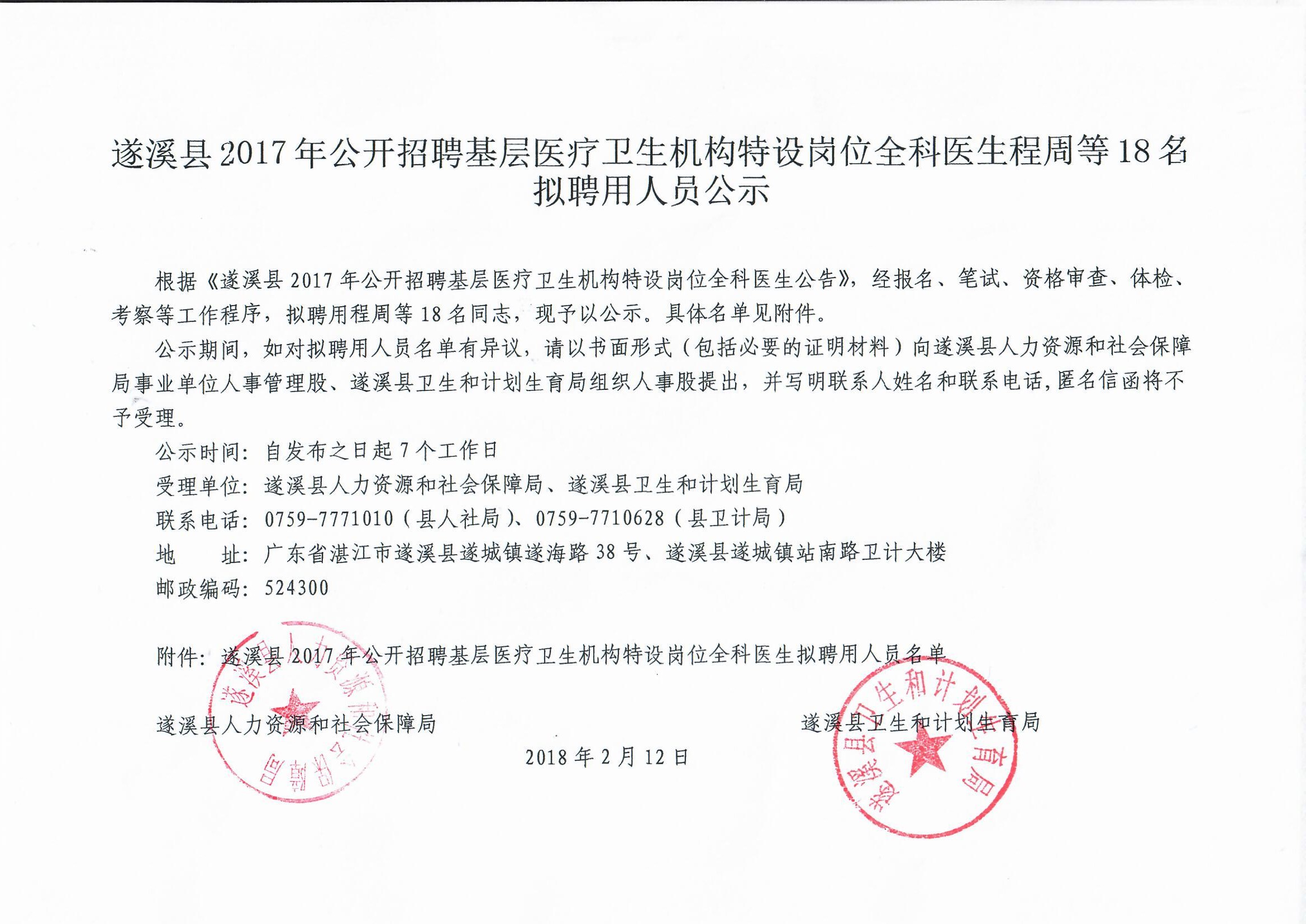 遂溪县2017年公开招聘基层医疗卫生机构特设岗位全科医生程周等18名拟聘用人员公示