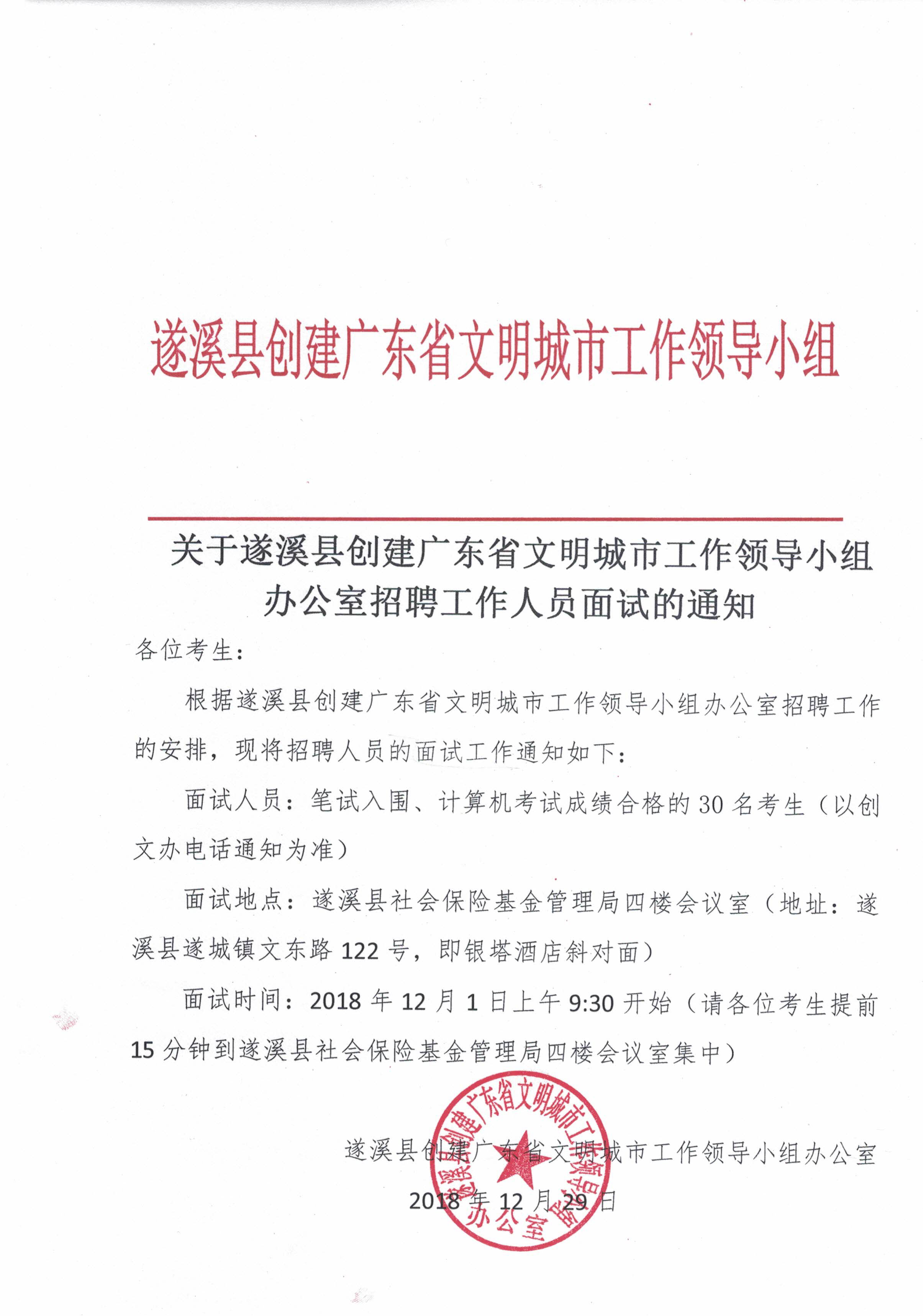关于遂溪县创建广东省文明城市工作领导小组办公室招聘工作人员面试的通知 | | 作者: | 来源:本网 | 时间:2018-11-29 16:22:00 点击数:- 遂溪县创建广东省文明城市工作领导小组办公室招聘工作人员面试名单 【打印正文】