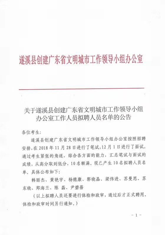 关于遂溪县创建广东省文明城市工作领导小组办公室工作人员拟聘人员名单的公告