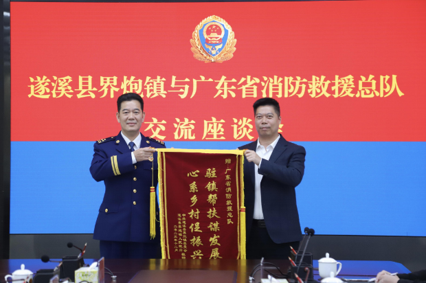 随后,省消防救援总队党委委员、副总队长袁奕之与梁李兴书记一行召开座谈会。会上,梁李兴书记详细介绍了驻镇工作队两年来的工作成效、2023 年镇经济和社会发展情况以及下一步的工作思路,并为总队送上感谢信、锦旗。袁奕之副总队长就助力界炮镇乡村振兴工作和“百千万”工程建设表示:一是总队将坚决扛起政治责任,按照中央和省委省政府关于乡村振兴和高质量发展的决策部署,一如既往地全力支持界炮镇发展特色产业, 提升人居环境品质。二是持续深化“界炮农产品走进火焰蓝”消费帮扶活动,高标准推动“消防安全示范镇”建设,高品质推动全省消防系统“1+l+N”结对帮扶行动。三是依托资源禀赋、生 态禀赋,全力配合界炮镇把乡村资源优势、生态优势、文化优势转化为产品优势、产业优势,增强市场竞争力和可持续发展能力。