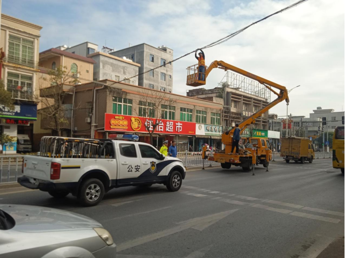 县科工贸局联合岭北镇政府、县城综局、县交警大队等部门,组织移动、电信、路灯管理所等单位,出动1台高空作业车、2台施工车、10名施工人员,对岭北镇区内国道、省道的“三线”进行专项整治。
