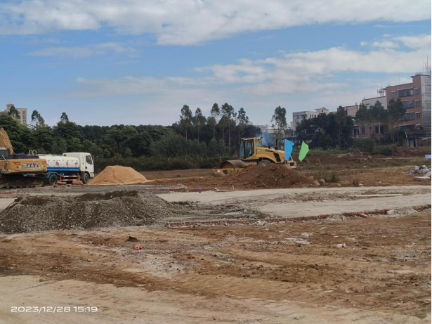 (三)中铁七局对绿美小公园建设项目进行施工。绿美小公园结合当地文化习俗,融入绿美生态小公园设计,建有休闲廊架及运动场,为周边居民群众提供运动休闲空间。今日派出施工人员12人,钩机3台、铲车1台,完成地面清表、平整工序以及全部的垫层浇筑。