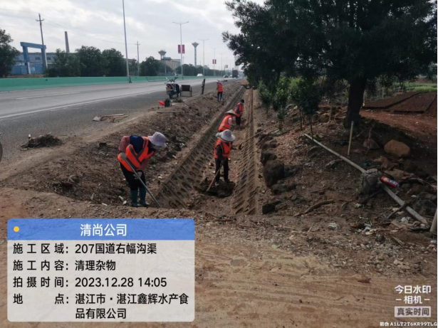 (七)清尚集团对国道G207路段(那杰村至岭北驿站)打造岭北美丽圩镇项目进行清表。今日派出施工人员14人,挖机2台,累计完成清表作业地表部分16417平方米、水沟部分2596米。