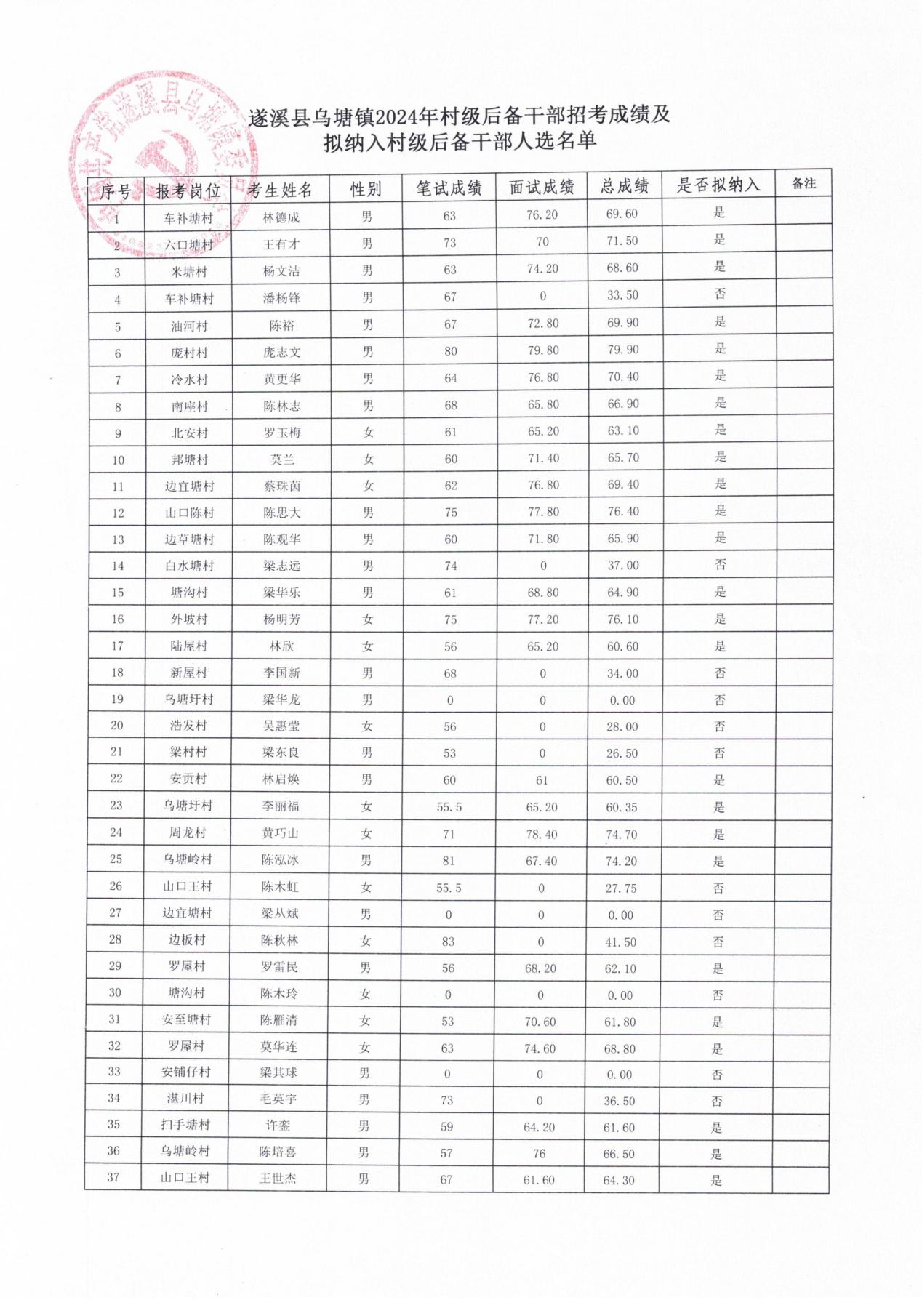 遂溪县乌塘镇2024年村级后备干部招考成绩及拟纳入村级后备干部人选公示