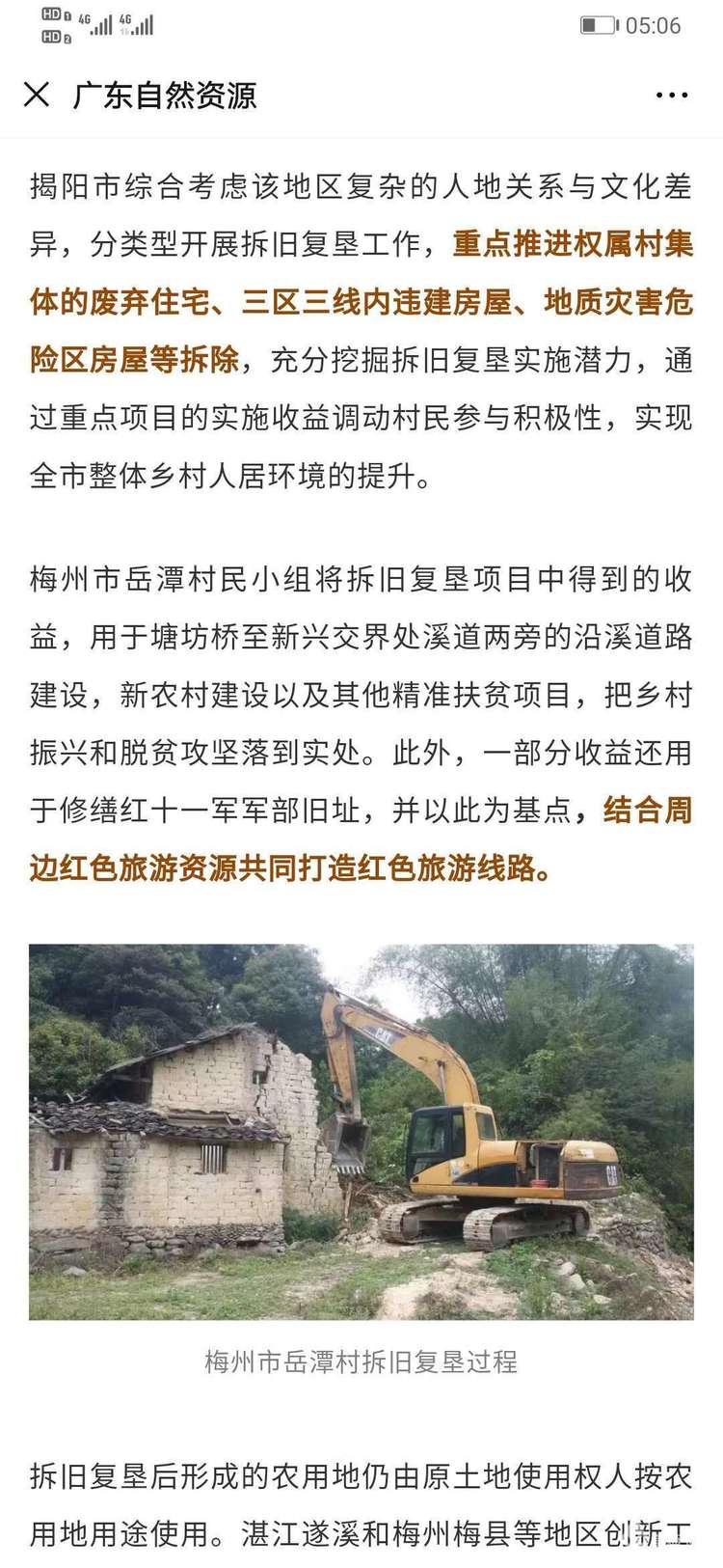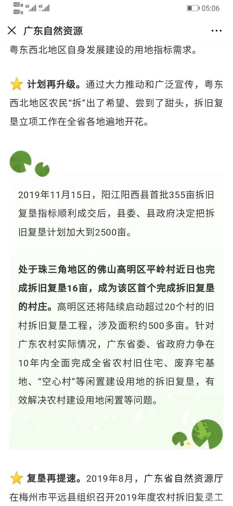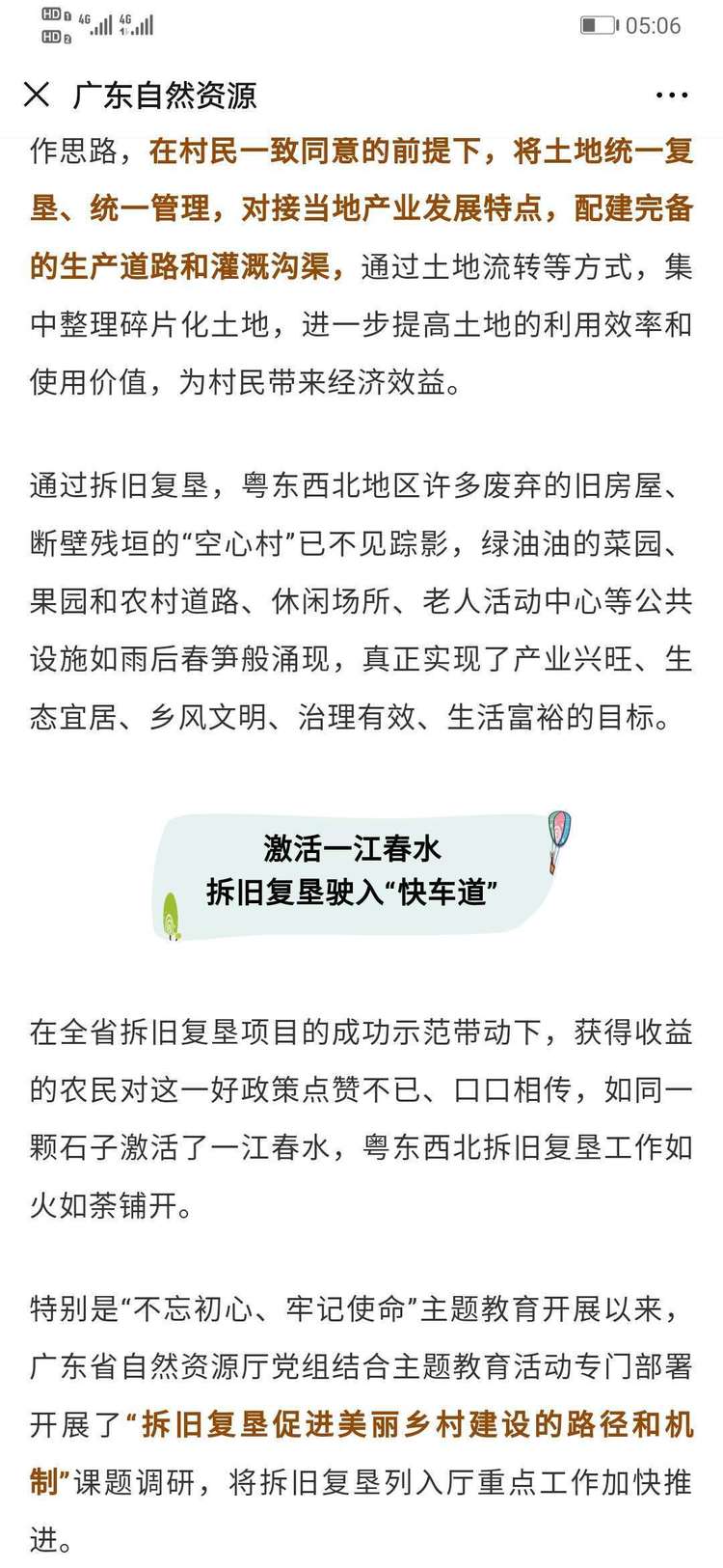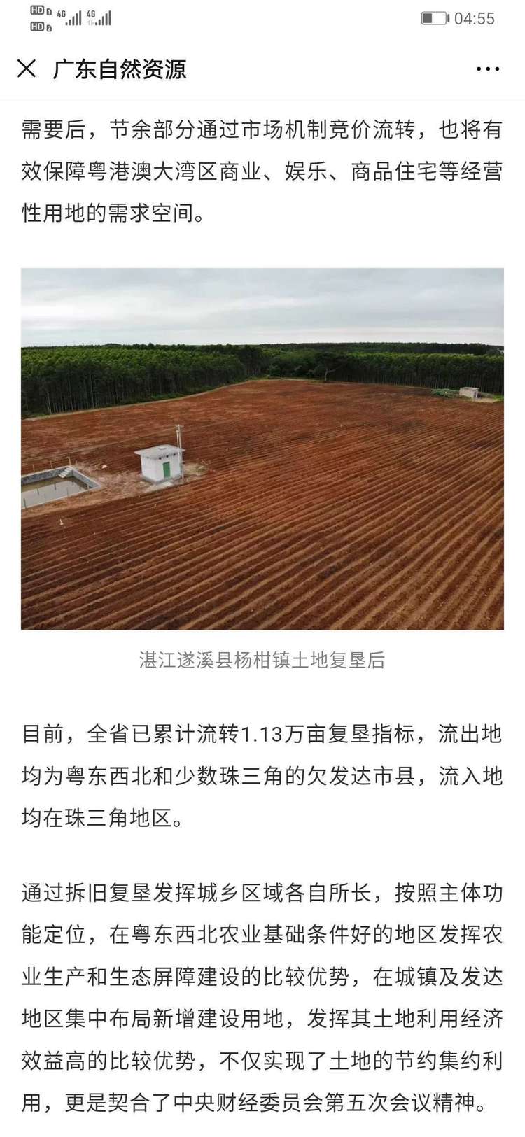 5、示范引领贡献:拆旧复垦创出“算好四笔账”经验得到市自然资源局充分肯定并全市推广。松树坑尾村、龙眼草南村两个拆旧复垦点被选定为市自然资源局现场会参观点。广西柳州发改局、市委政研室、坡头区、兄弟镇等单位先后组团到点参观学习。龙眼草南村复垦后现状图片还被广东省自然资源厅宣传文章《广东拆旧复垦驶入快车道》采用。